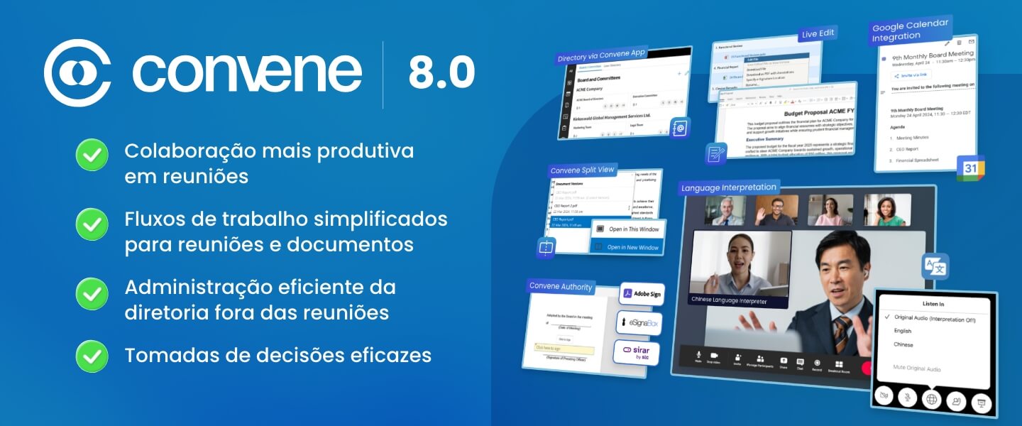 Outros aprimoramentos importantes da Convene 8.0 incluem o Agenda Whiteboard, o arquivamento de registros históricos, a criação de várias reuniões por meio da importação de arquivos e muito mais. Para ver a lista completa de novos recursos, os clientes existentes podem acessar a página O que há de novo na Convene.